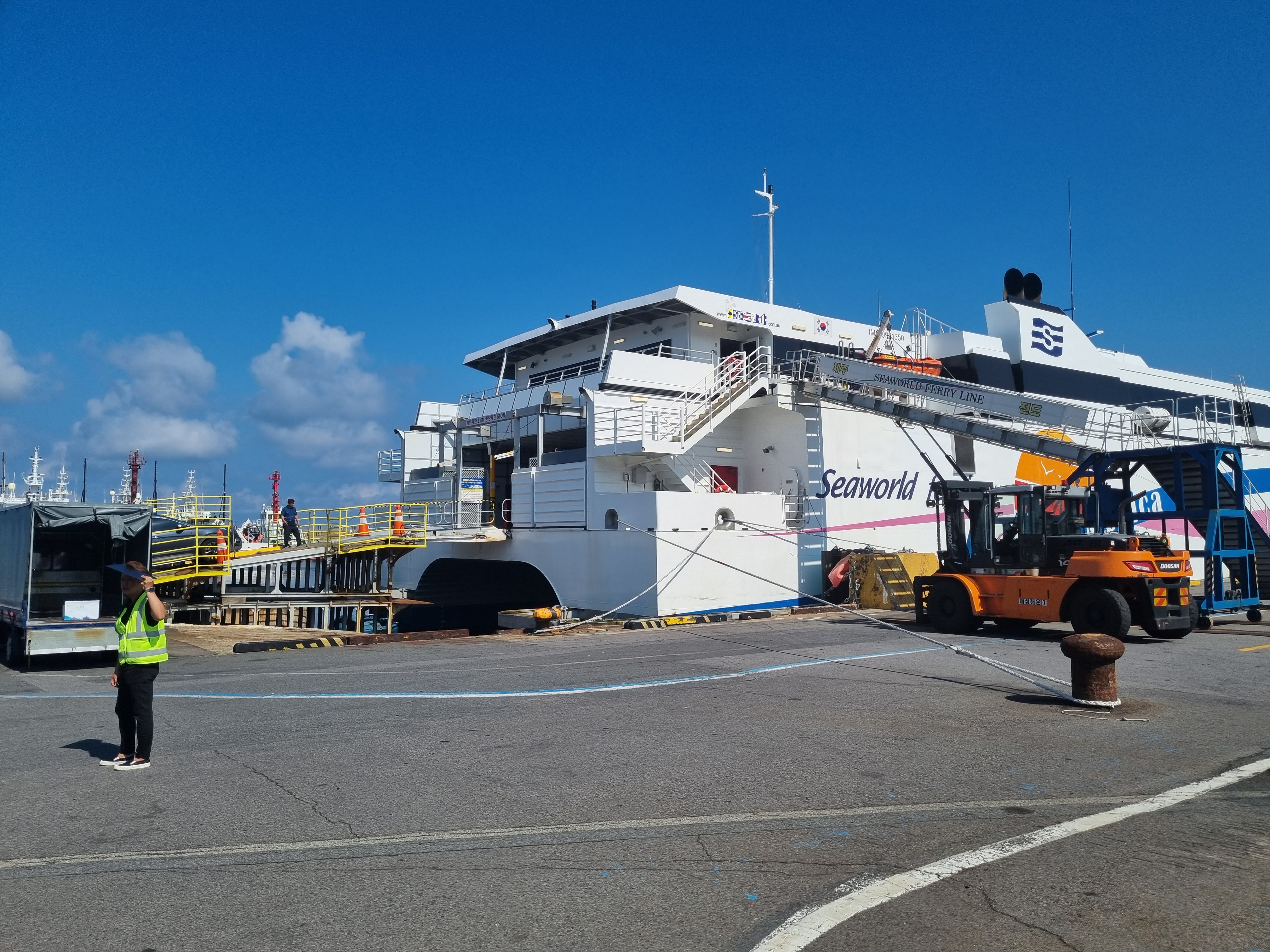 제주항 제2 부두 앞에 가면 남자직원분이 입구 쪽에서 방금 산타모니카호에서 내리는 차량들과, 주차자에서 나오는 차량들을 내보내주고,